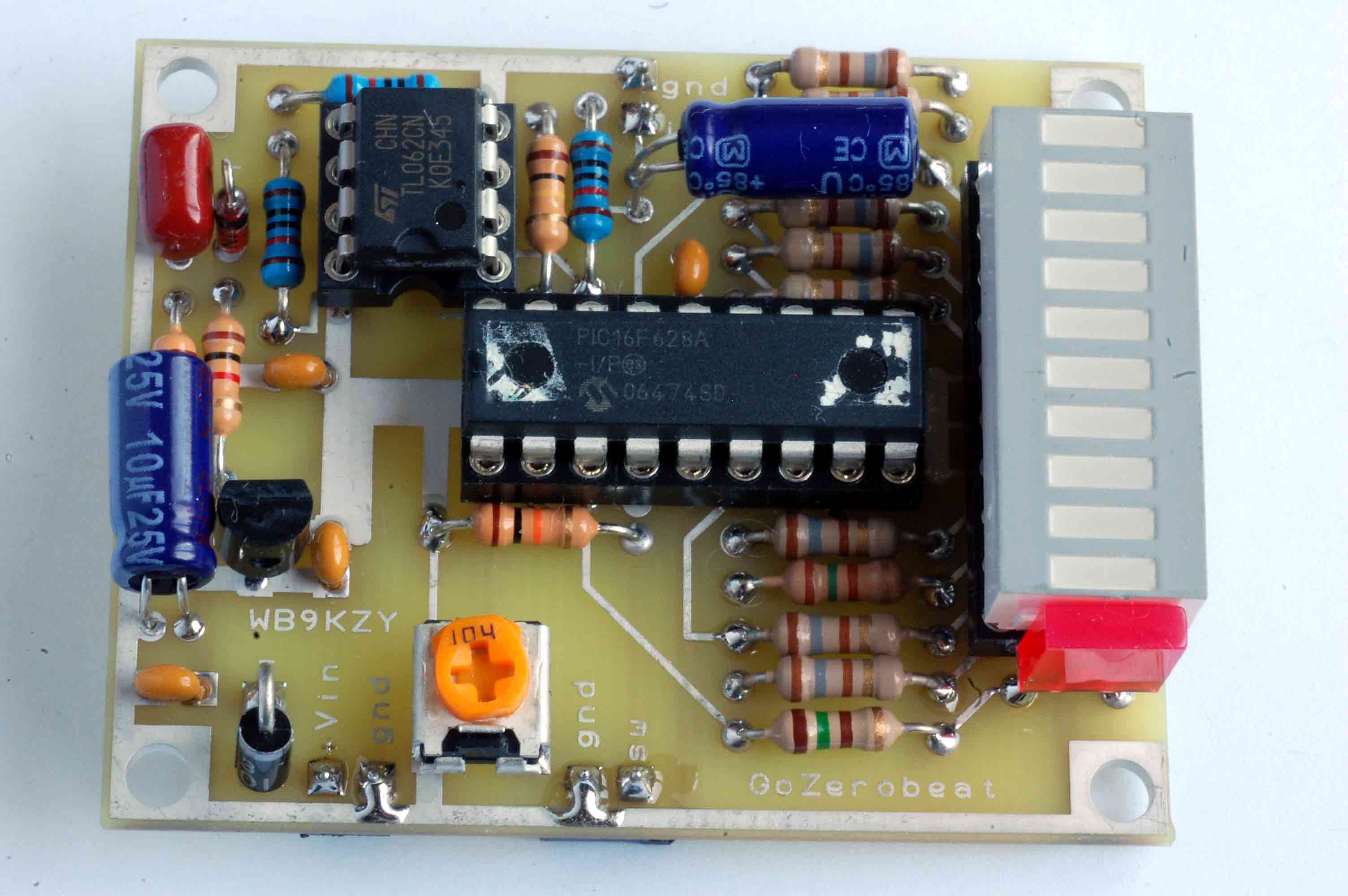 Grandson of Zerobeat has 9 LEDs which graphically indicate the frequency of a received CW audio tone. Adjust your transceiver's
