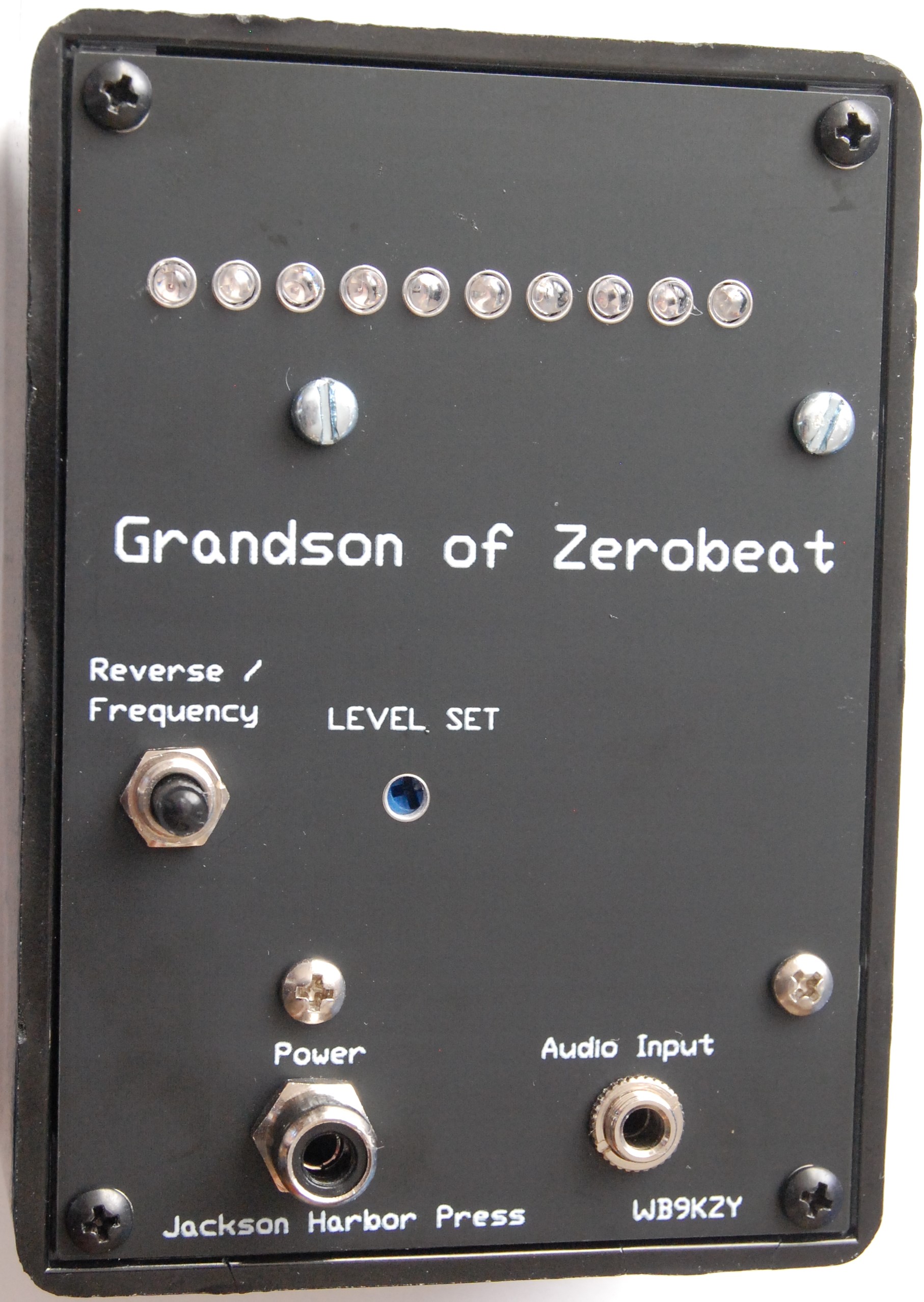 Grandson of Zerobeat has 9 LEDs which graphically indicate the frequency of a received CW audio tone. Adjust your transceiver's