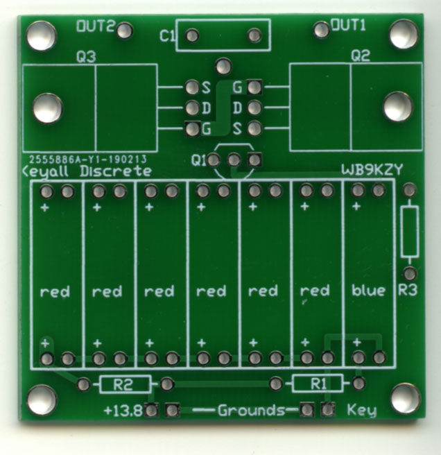 The Keyall Discrete kit allows the owner of a keyer with a low voltage positive (NPN or n-channel MOSFET) keying transistor to drive the vacuum tube transmitters and transceivers of yesteryear. This unit will key negative voltage rigs (grid block keying) or positive voltage rigs (cathode keyed tube transmitters and conventional +13.8V powered solid state rigs). The output transistors and capacitor are rated at 1000 V and 3.1 A (3100 mA). The Keyall Discrete will normally key a single transmitter. The use of the word: discrete refers to the fact that only LEDs, transistors, resistors and a capacitor are used in the kit, no ICs (Integrated Circuits) are used.