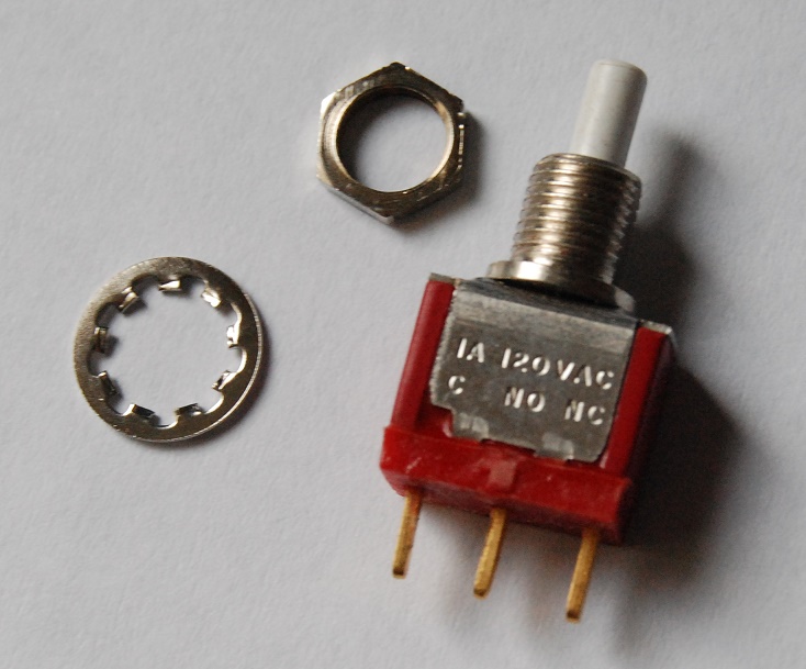 This DPDT switch has 6 solder lugs - Mouser / Digikey don't stock this item but their listed prices are well over $10 each ! After the finish nut has been fully threaded on the switch the hex nut is tightened (from the back of the panel) to secure the switch.
